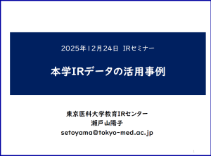 令和7年(2025年)12月24日に第2回IRセミナーを関西医科大学と共催で開催いたしました。本学からは教育IRセンター准教授の瀬戸山陽子が、卒業生アンケート、初期研修医の研修開始時における診療能力に関する評価の結果をも […]